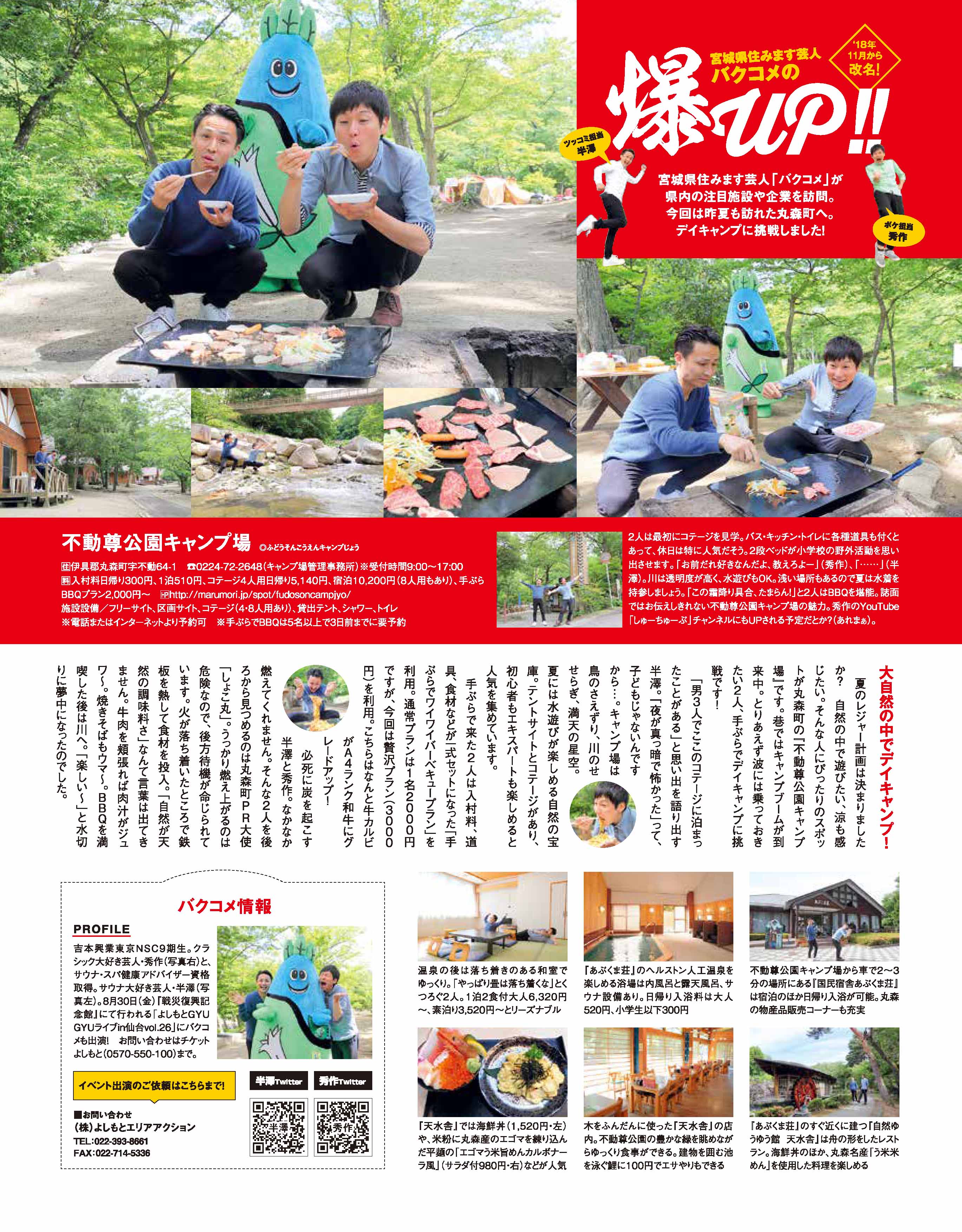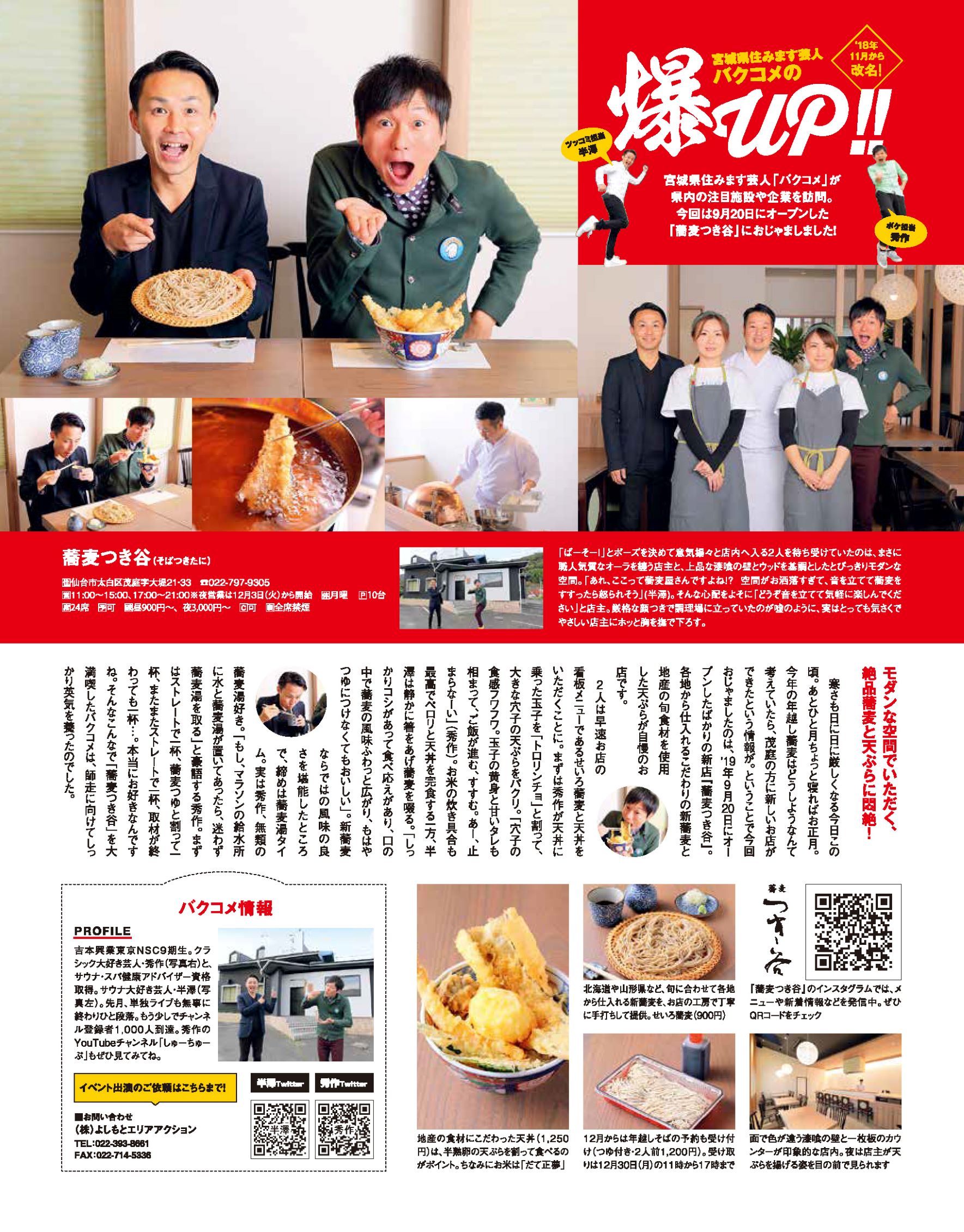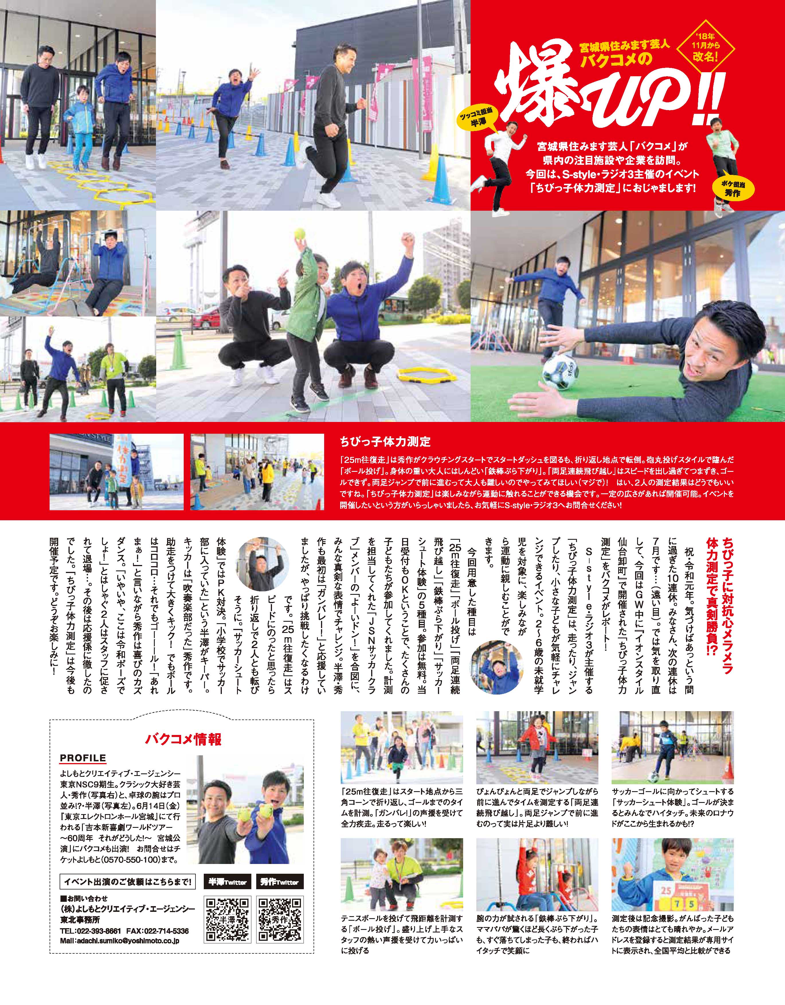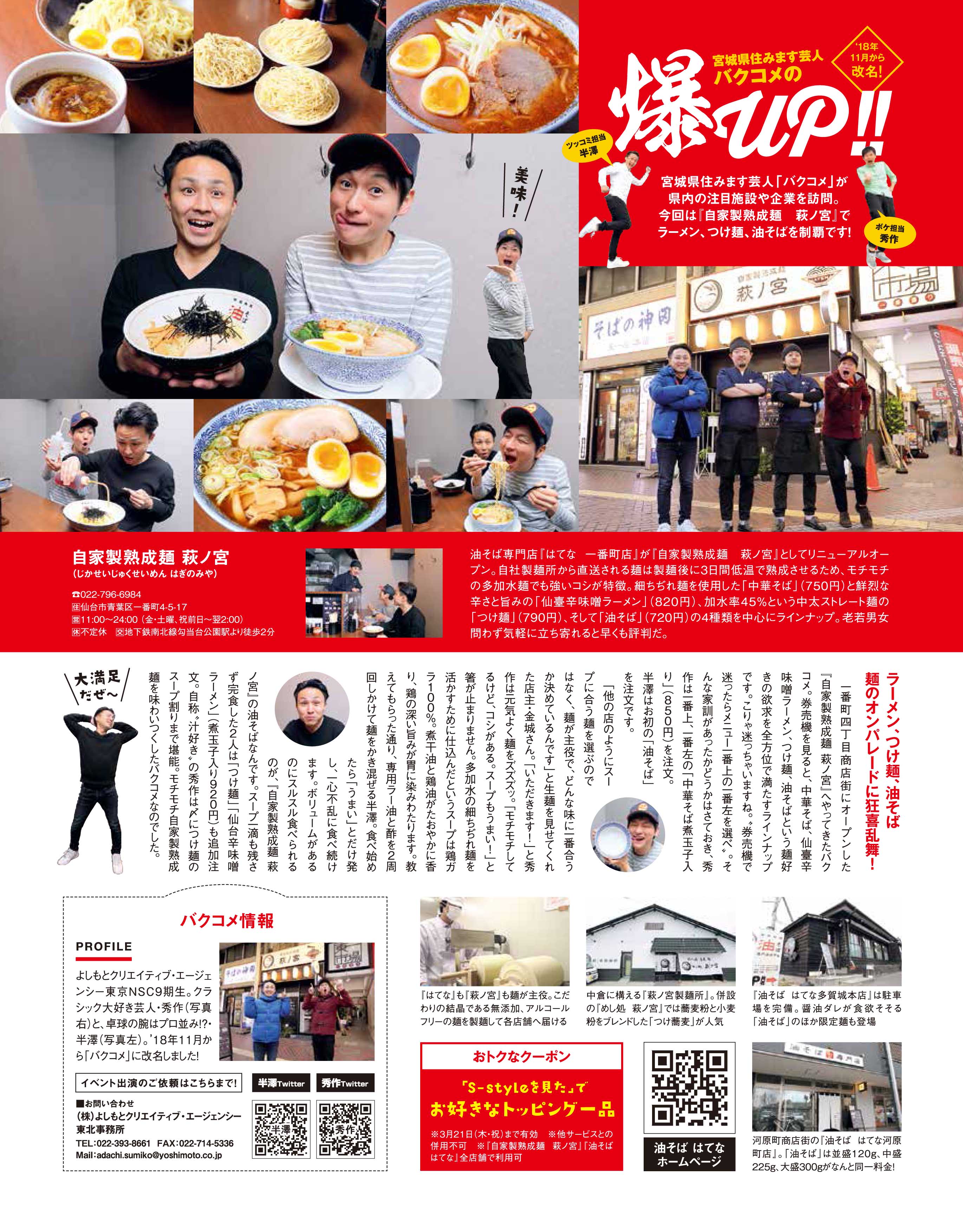 宮城県住みます芸人の「バクコメ」(爆笑コメディアンズより改名)の2人が、施設や企業、商品をレポートする『せんだいタウン情報S-style』の人気連載企画です。さらには、『日刊せんだいタウン情報S-style Web』での取材レポートや動画の配信も行う、“雑誌”דWeb”ד映像”のクロスメディア企画となっております。
