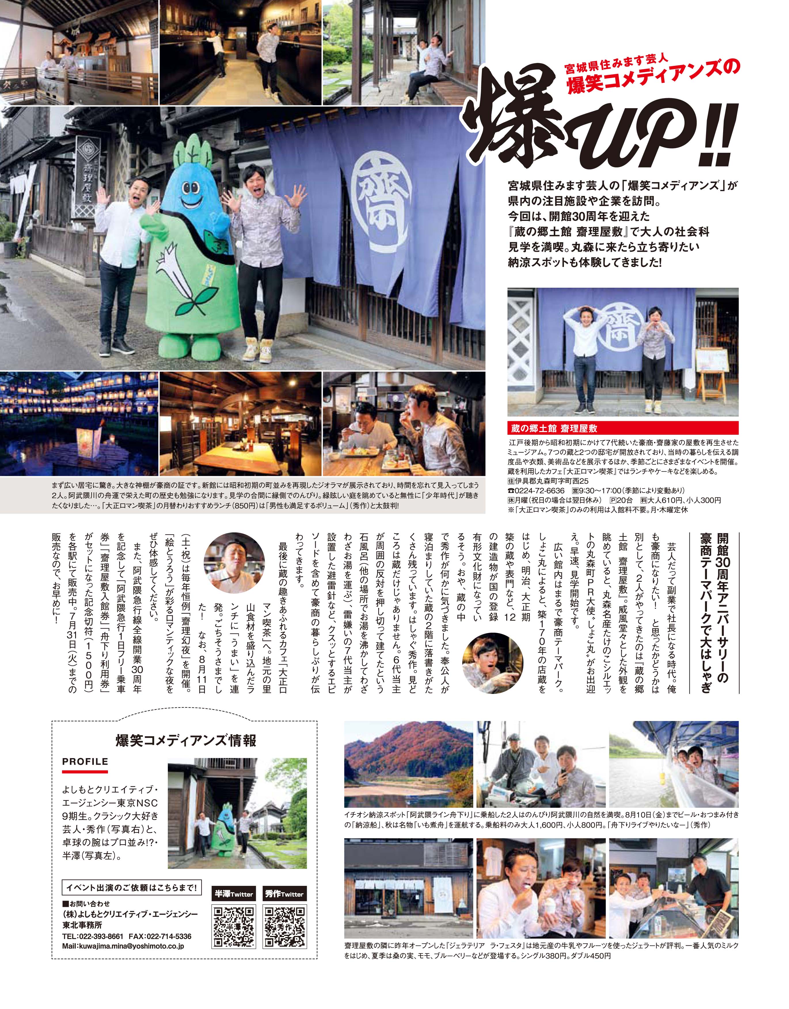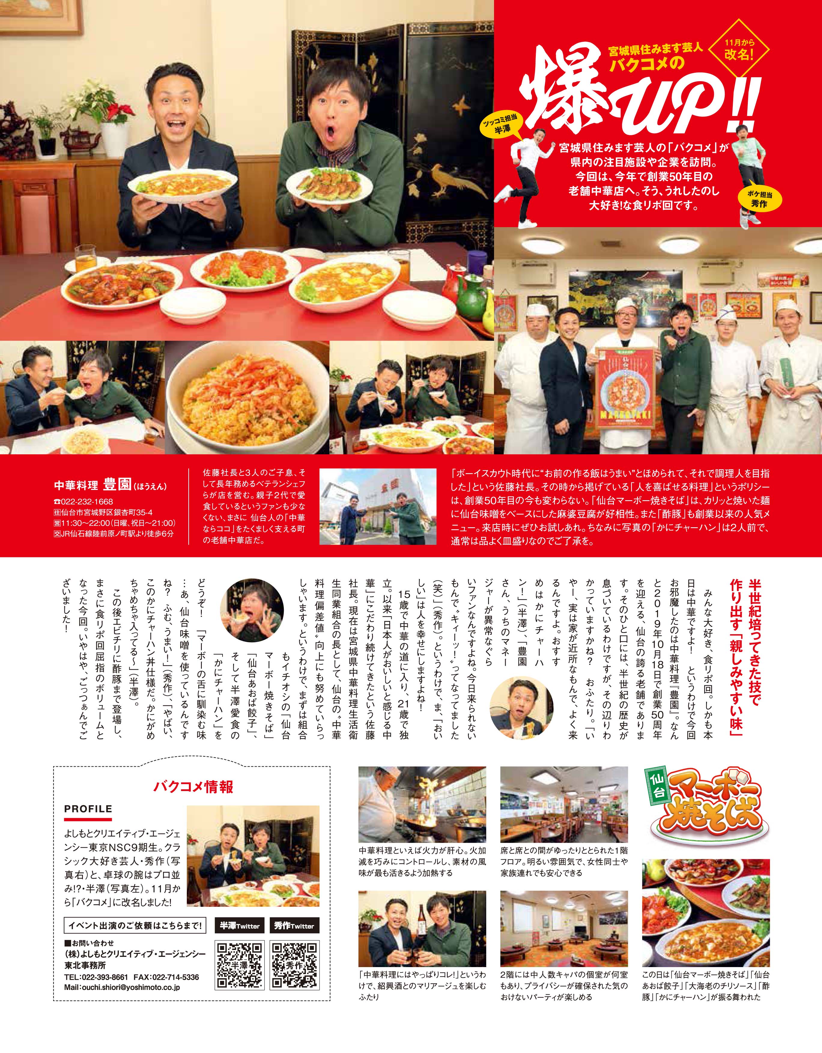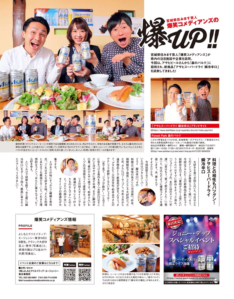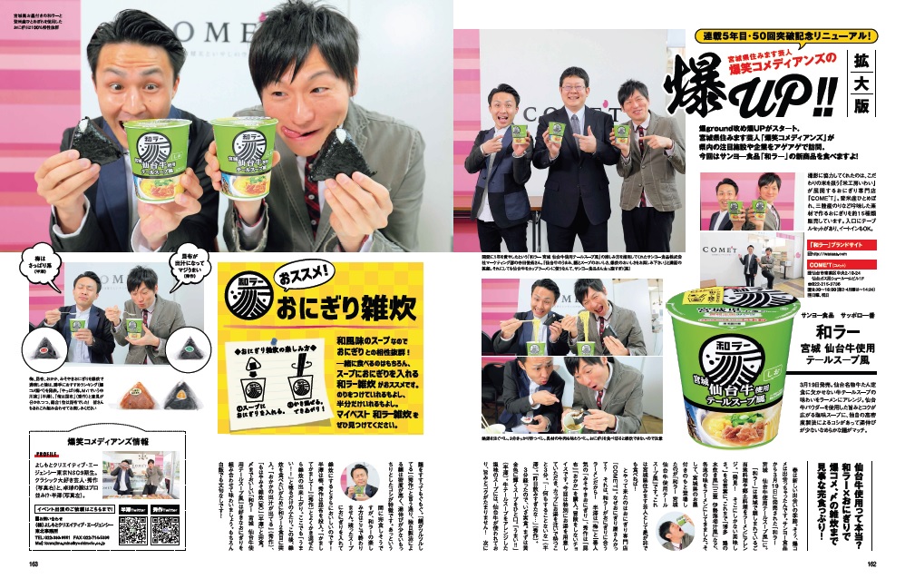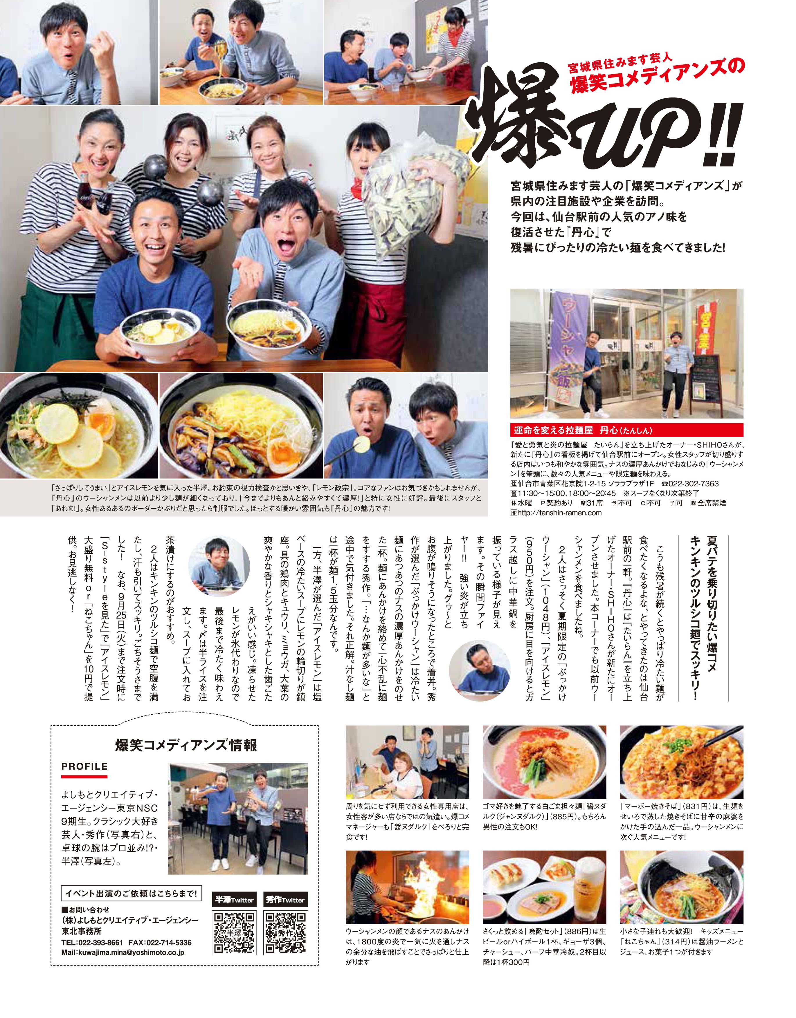 宮城県住みます芸人の「バクコメ」(爆笑コメディアンズより改名)の2人が、施設や企業、商品をレポートする『せんだいタウン情報S-style』の人気連載企画です。さらには、『日刊せんだいタウン情報S-style Web』での取材レポートや動画の配信も行う、“雑誌”דWeb”ד映像”のクロスメディア企画となっております。