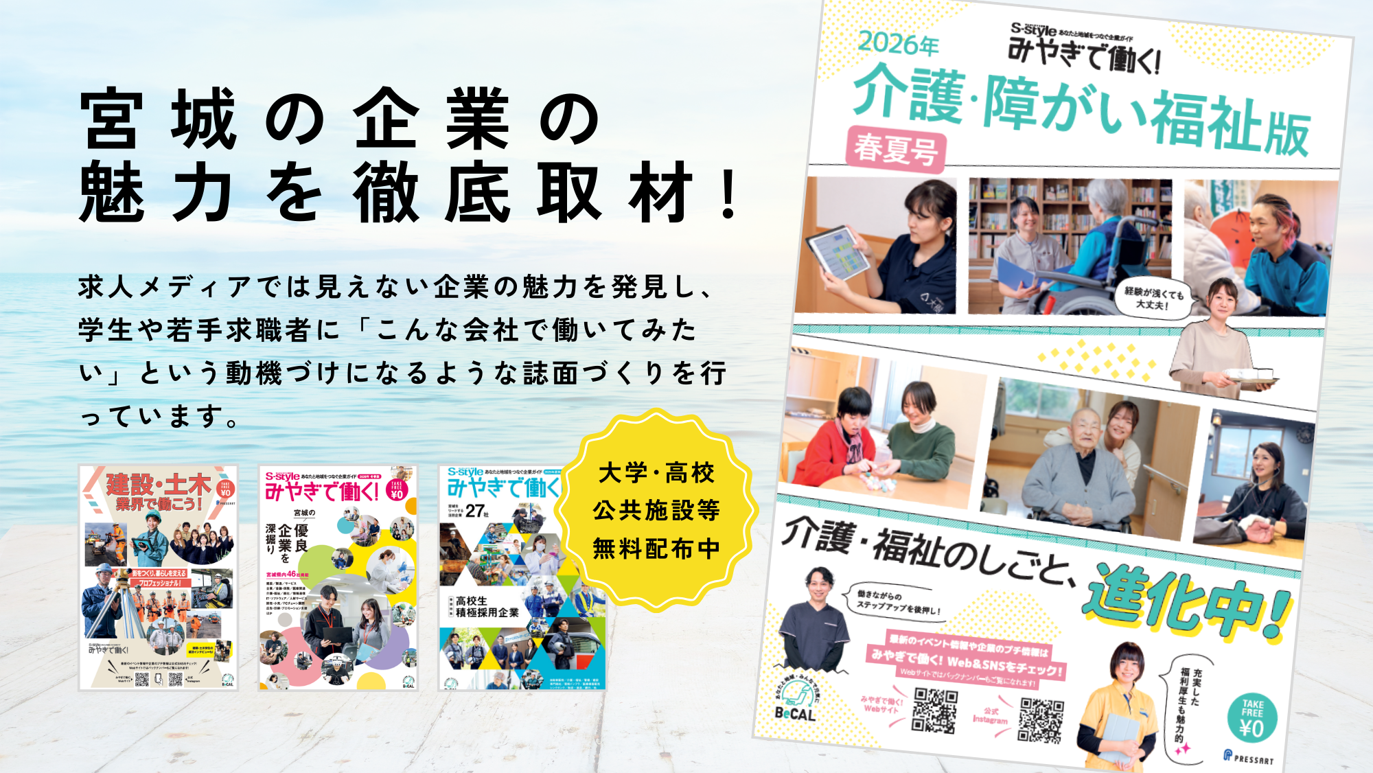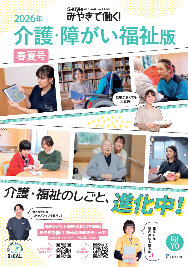2026年2月27日に『みやぎで働く!2026介護・障がい福祉版 春夏号』がリリースされました。介護・障がい福祉業界で働きたい人におすすめの企業・法人情報が満載!ハローワークや県内の一部書店、県内の大学・専門学校・高専・高校のほか、東北、首都圏の一部大学で設置配布しています。